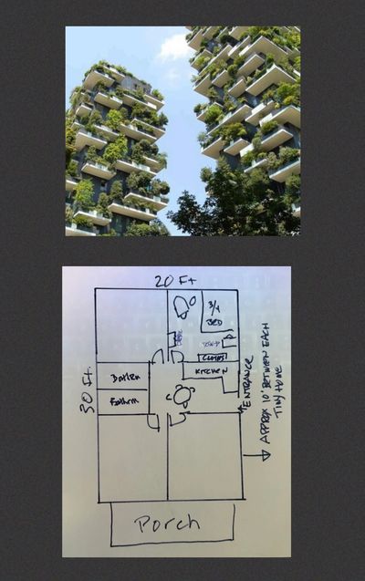 Most tiny homes will have 4 bedrooms - 2 in the front back & 2 in the back. There will be a side entrance & at the entrance will be 1 (or 2) bathroom with a half tub/shower a kitchen & a table / all eating will be in common dining rooms on the lower floors. Each tiny home will have a porch in the front. The floor plan is shown.