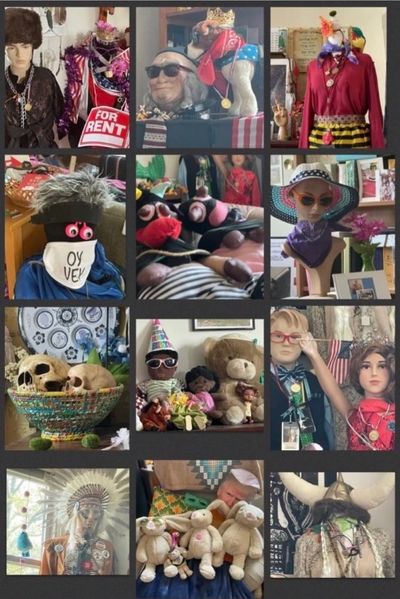 2. My "old budy" Hweman. We met in a Haloween store about 30 years ago got along right away - I think we knew eachother in a previous life. He wars a kippah (head covering) but never goes out to Synagogue - he says he'll just "stay pur". Next to him is my "faithful dog", Spot. Spot's a good dog, but Spot is a stupid dog: "Sit, Spot, sit" - nothing - he doesn't move. Oh well. He, like every other dog, when he looks at me seems to be sayingz "Do you love me as much as I love you?" I WAS a dog in a previous life &. loce, & get along with, all doges. I HATE CATS - don'e even like looking at a picture of them & hated he musical Cats!